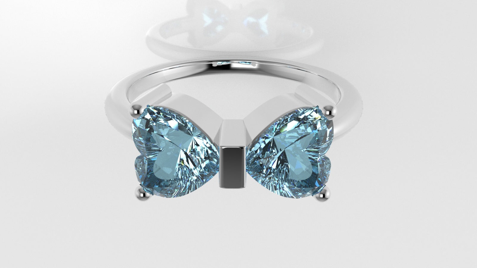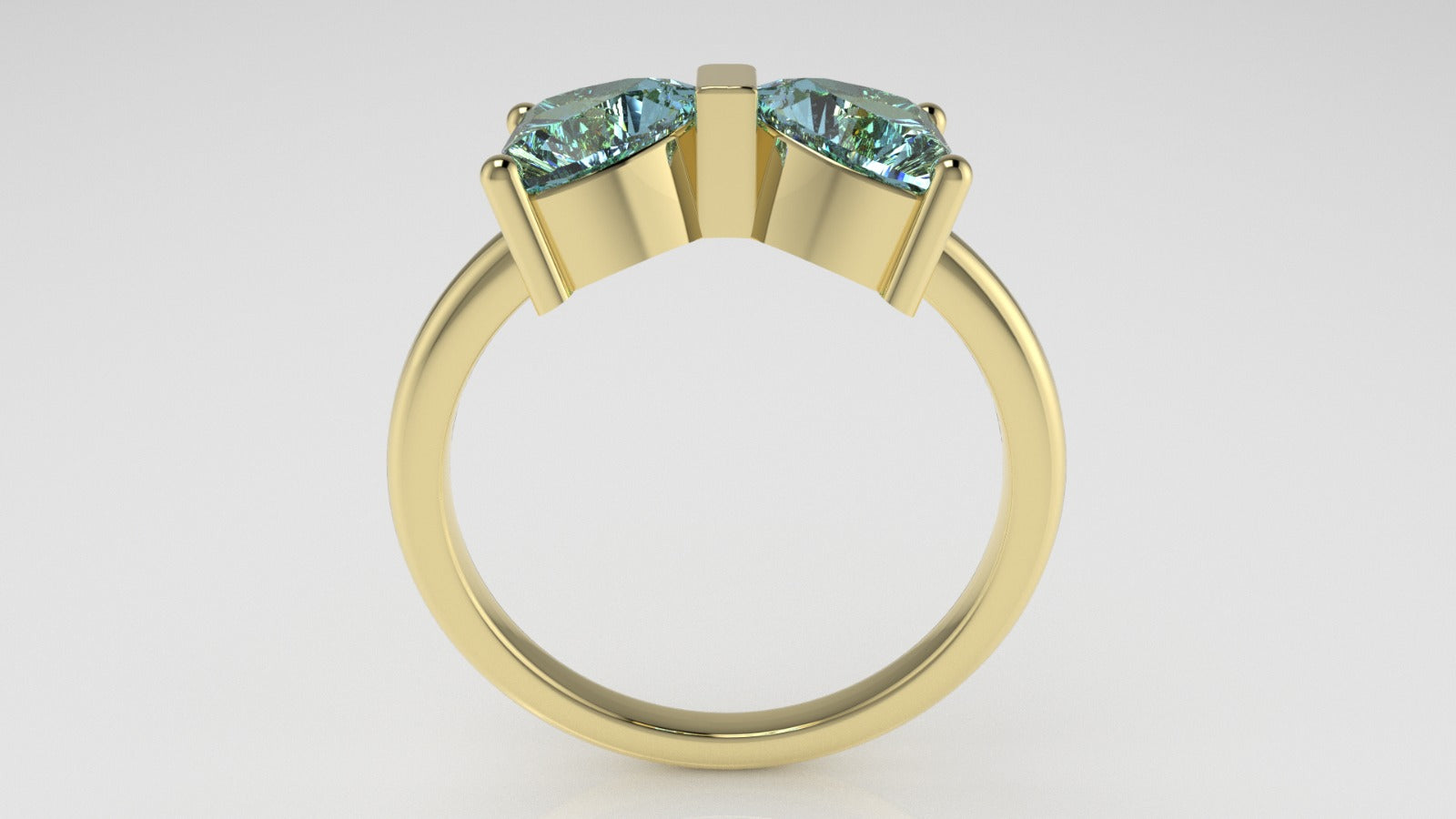 14K yellow gold band Ring with 2 AQUAMARINE, stt prong, stone heart, "bow shape with hearts"