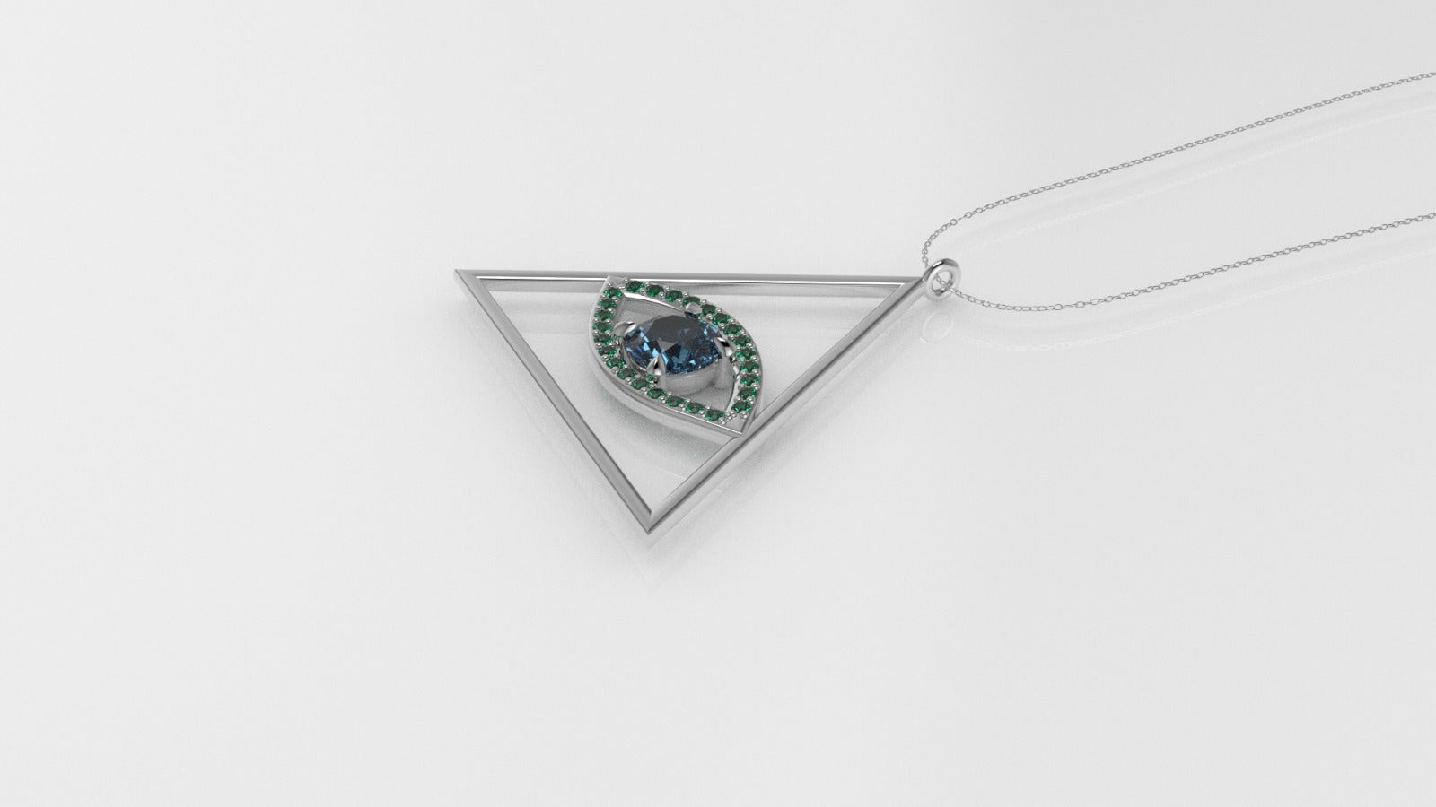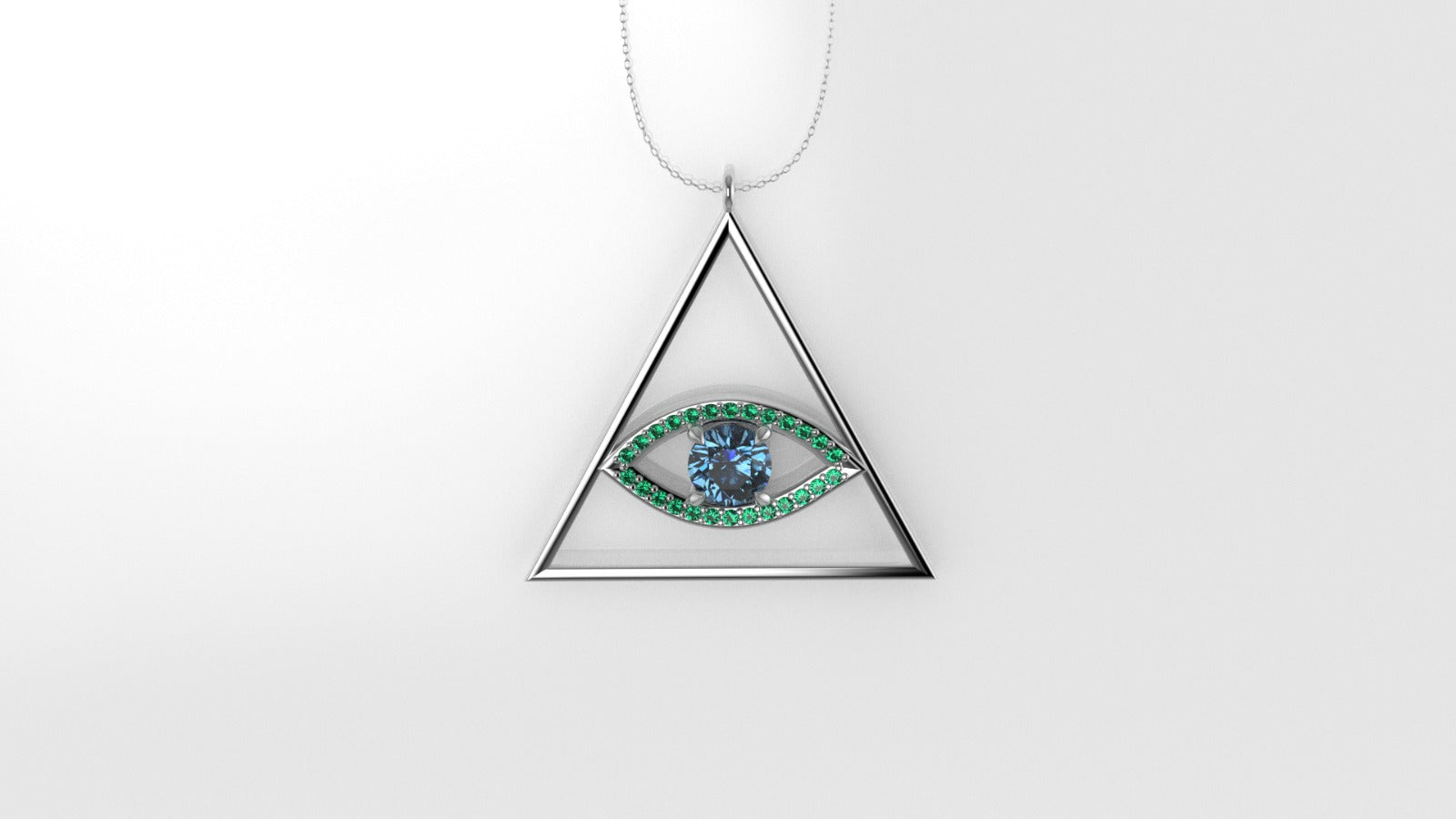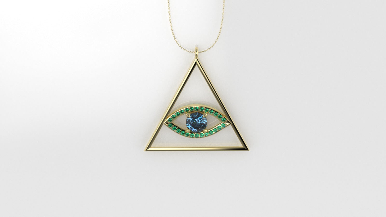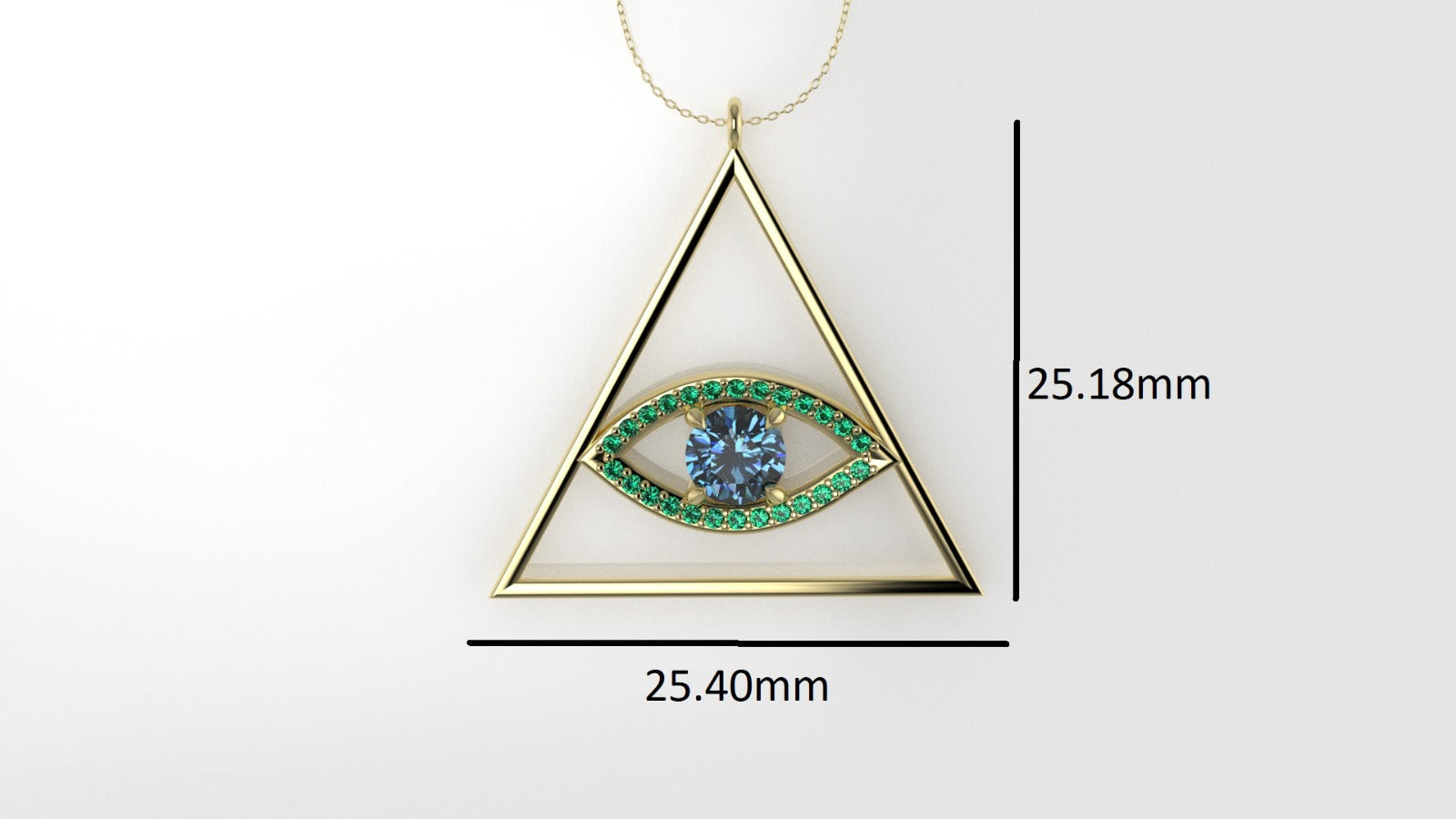 14K Pendant with 26 Emerald 1mm each and 1 Blue Topaz 5mm, Only Pendant, "sacred eye of the pyramid"
