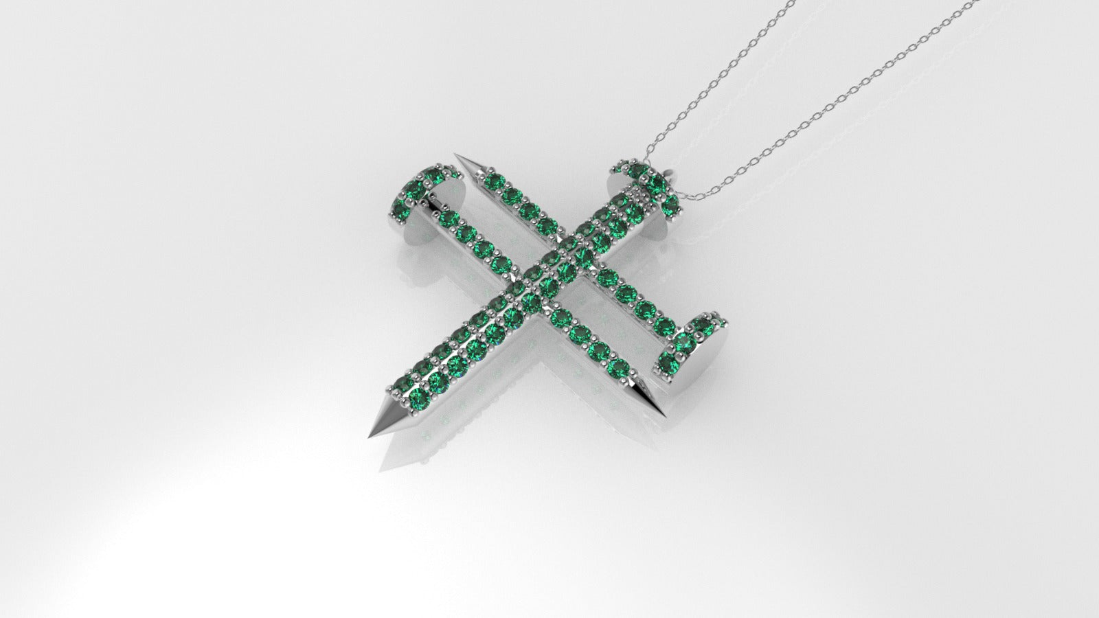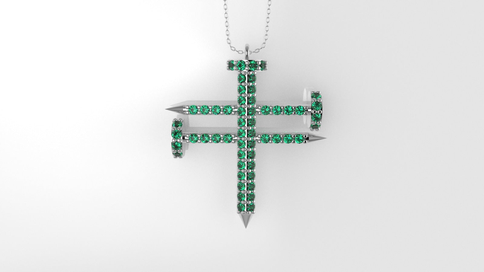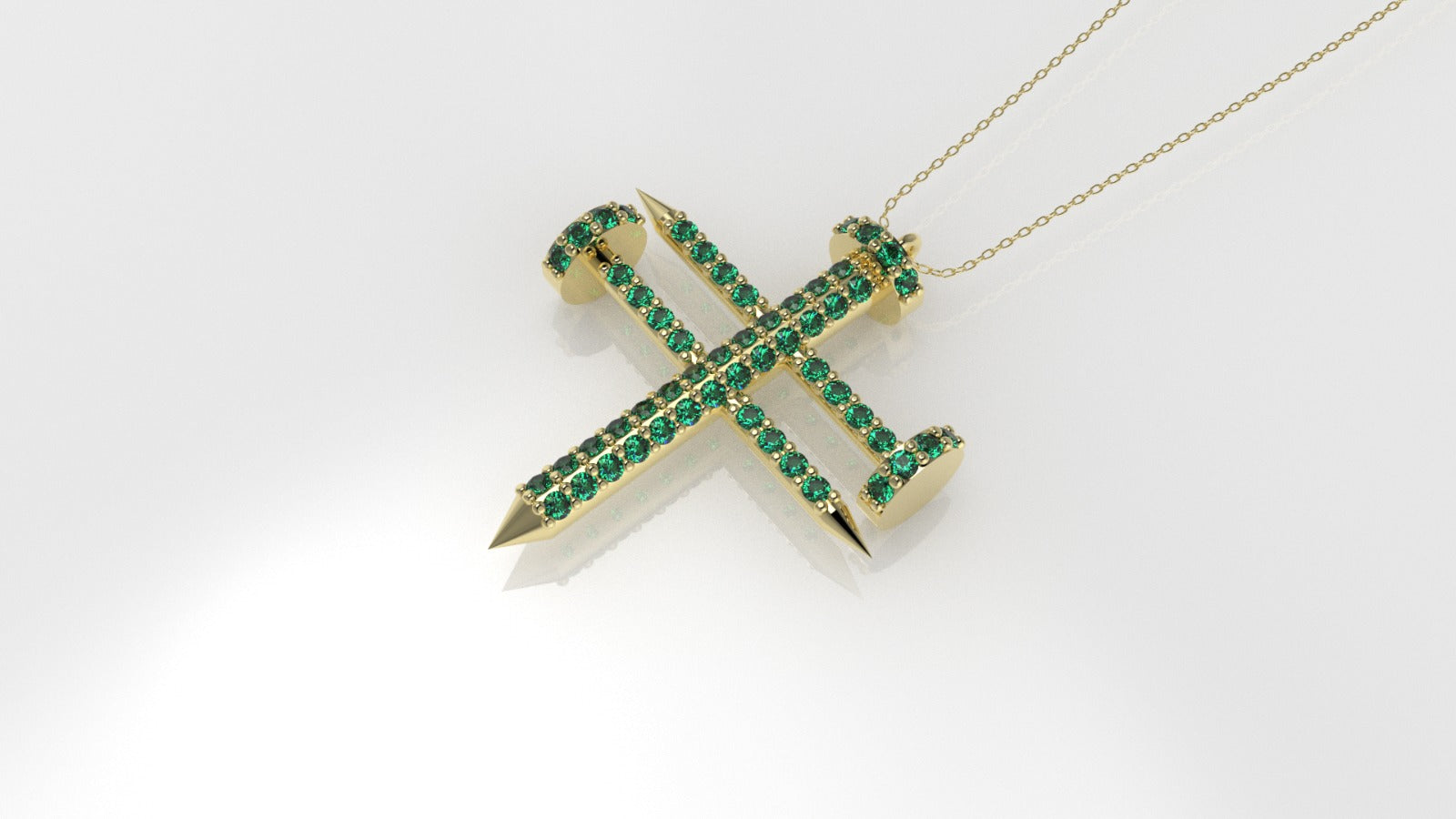 14K Pendant with 54 EMERALD 1mm each, Cross, Only Pendant, "crossed construction nails"